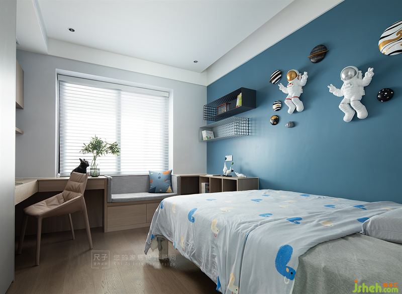 孩子的房間是活力滿滿的藍(lán)色調(diào),小主人熱愛的航天元素裝飾著這個空間。