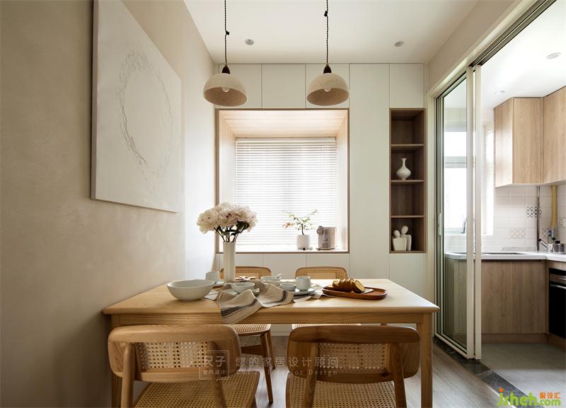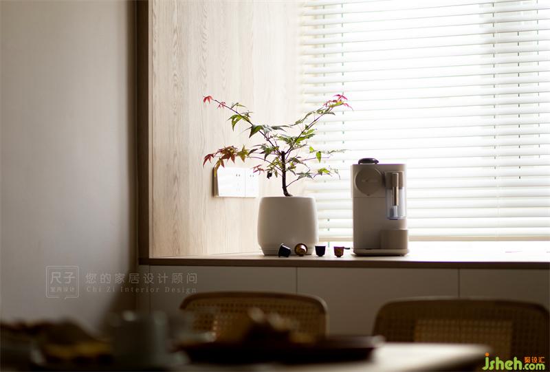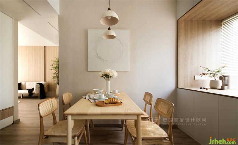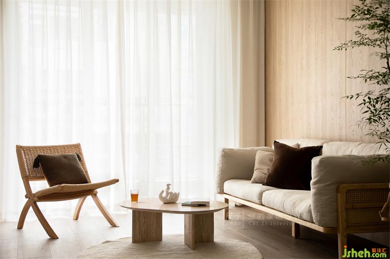 房子是標準的三室兩廳戶型,設計師以原木色+灰白為基調,部分墻面選擇肌理質感豐富的藝術涂料裝飾,再輔以綠植作點綴,打造陽光滿屋,自然感十足的日式禪意風格。