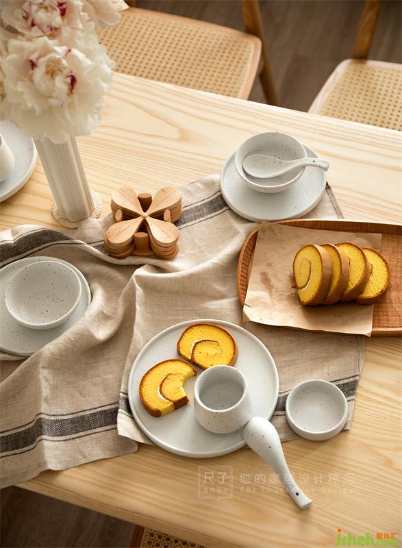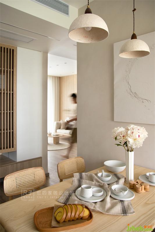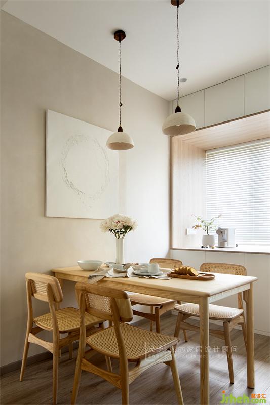 原木餐桌、藤編元素的餐椅給空間增添了一抹古樸的自然感,鮮花與枝葉點綴其中,為空間注入一股明媚的生機。