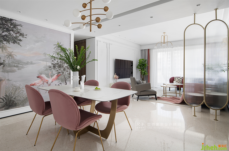 淺淡的筆墨自帶朦朧美感,勾繪出山川叢林,以及在河流中自由舒展身姿的火烈鳥;邁入餐廳,就仿若置身于浪漫的大自然。