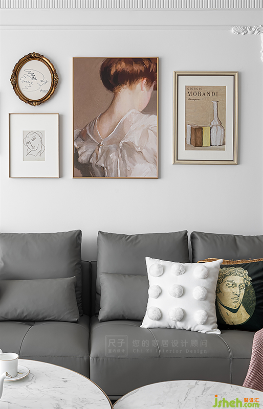 背景墻與掛畫的搭配在鋪陳設(shè)計上也有著些許小心機:淺灰藍藝術(shù)涂料特意保留涂抹的痕跡,使得原本靜謐安靜的色調(diào)有了靈動的變化。