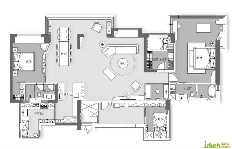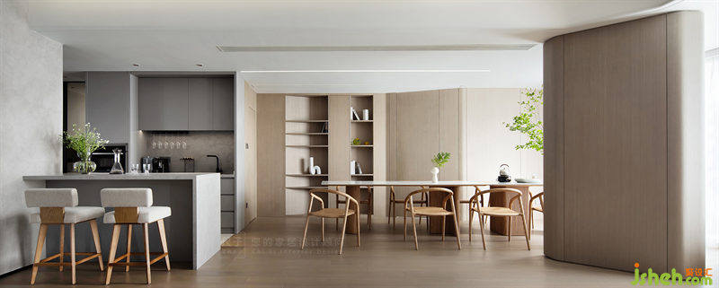 公共區(qū)域是一個整體,天花流暢的弧度展現(xiàn)出幾何的秩序與美感,木色、灰色的色塊與材質(zhì)過渡應(yīng)對空間的功能劃分。