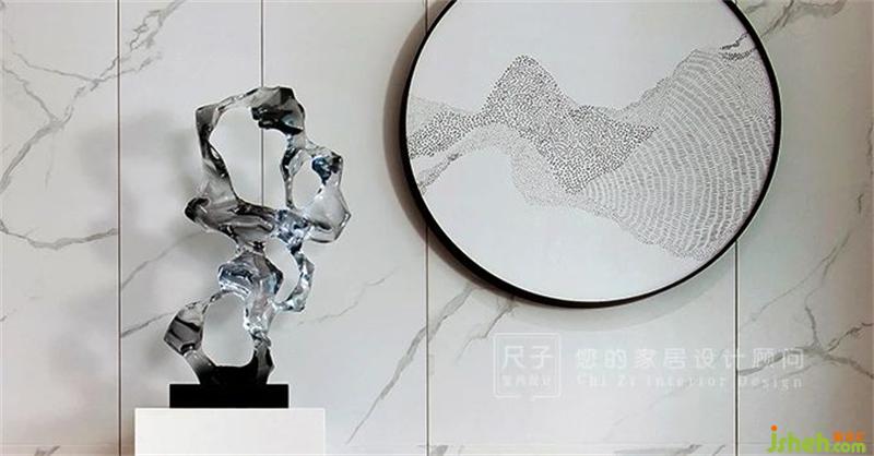 墻面裝飾畫,不規(guī)則的線條無限綿延,將視線牽引至地面,圓形的地毯與茶幾,一大一小相映成趣。
