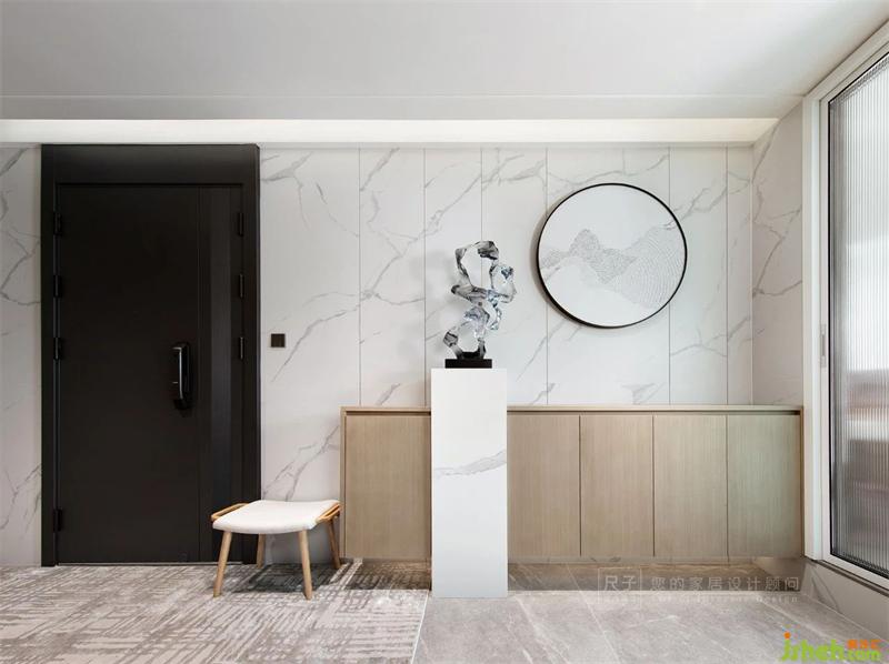 出電梯后是一個寬闊的門廳,豎線條分割的瓷磚墻面上懸掛著定制的手繪山水油畫,白色的中柱造型與其上的擺件將鞋柜切割,灰白木三色地構(gòu)成了這個有序空間。