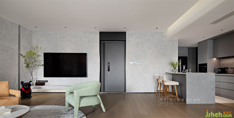 灰色藝術(shù)涂料奠定空間寧靜的基調(diào),淺松石綠與淡黃的單人沙發(fā)豐富著客廳的色彩感知,裝修設(shè)計(jì)以細(xì)微處的變動打破沉悶,構(gòu)建出輕松舒適、愉悅愜意的氛圍。