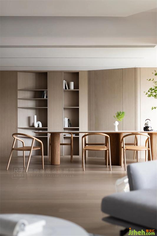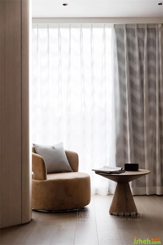 寬敞的落地窗邊,是靜謐的休閑區(qū),光影穿梭于室內(nèi),與純粹的木色一同展現(xiàn)出愜意安然的姿態(tài)。