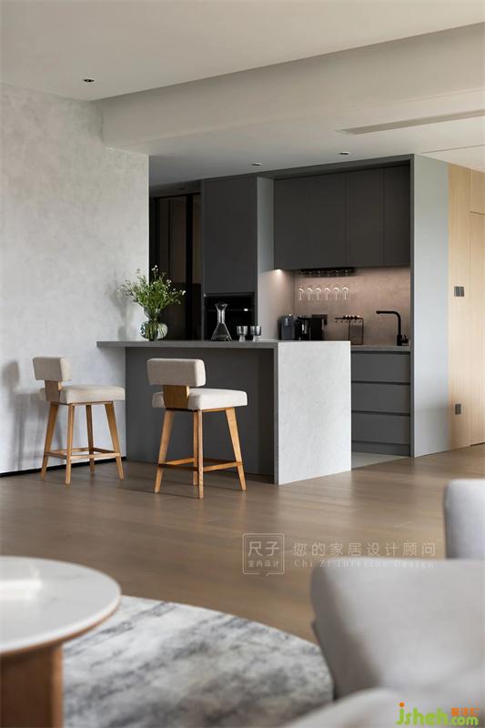 開放式的西廚區(qū)與客餐廳連為一個整體,素灰色的基底鋪陳出簡約的氣質(zhì),吧臺的設(shè)置讓空間多了絲不拘一格的隨性,后方杯架在燈光的映襯下,顯得更加輕盈。
