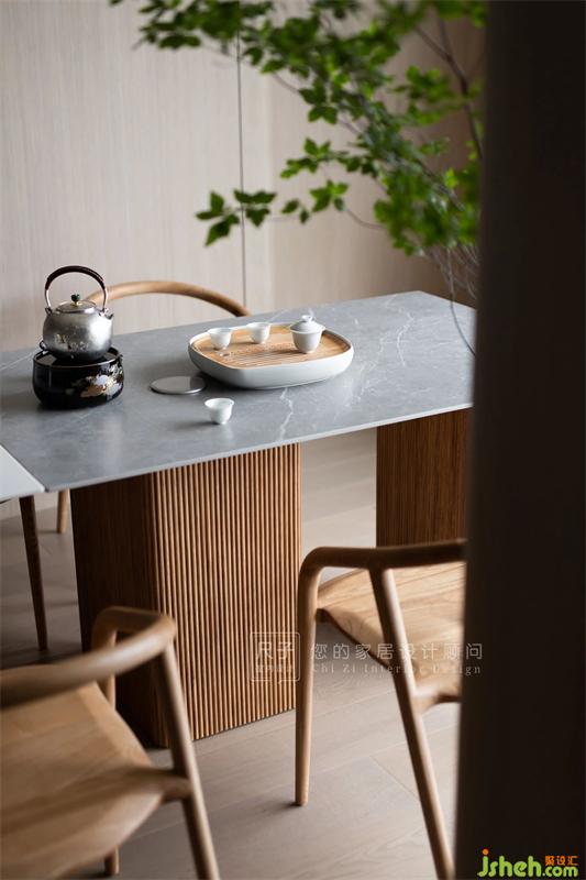 通透開闊的空間內(nèi),白色的巖板餐桌與灰色茶臺相接,溫潤的木作、蔥蘢的綠意,共同承載起餐廳的氛圍營造。