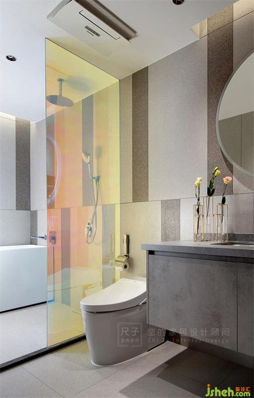 白色推拉門后是隱藏的主衛(wèi)空間,不同明度的灰色瓷磚搭配炫彩玻璃,在安靜的秩序中融入絢爛的美感。