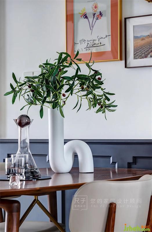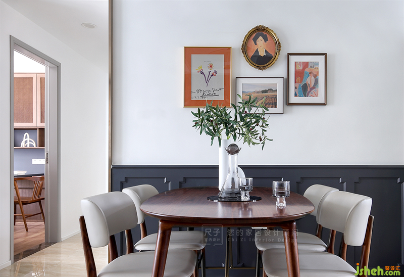 穿過(guò)玄關(guān)是這個(gè)家的餐廳,餐桌靠墻擺放,代爾夫特藍(lán)的護(hù)墻板造型,很好地保護(hù)了墻面,也讓用餐空間多了優(yōu)雅的儀式感。