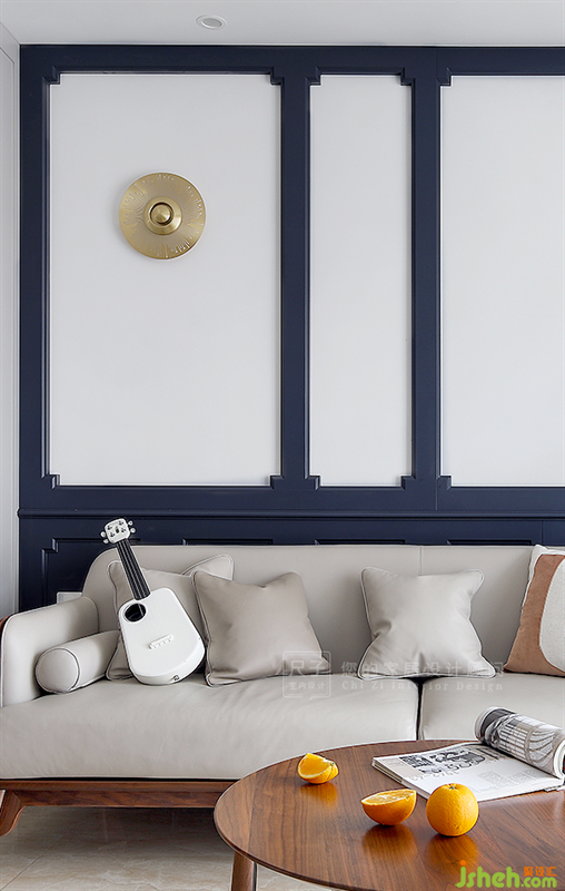 沙發(fā)背景借用護(hù)墻板分割的手法來(lái)裝飾墻面,再以不對(duì)稱的設(shè)計(jì)達(dá)到更加藝術(shù)的效果。