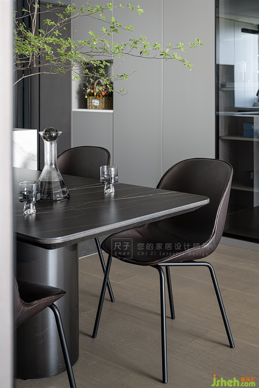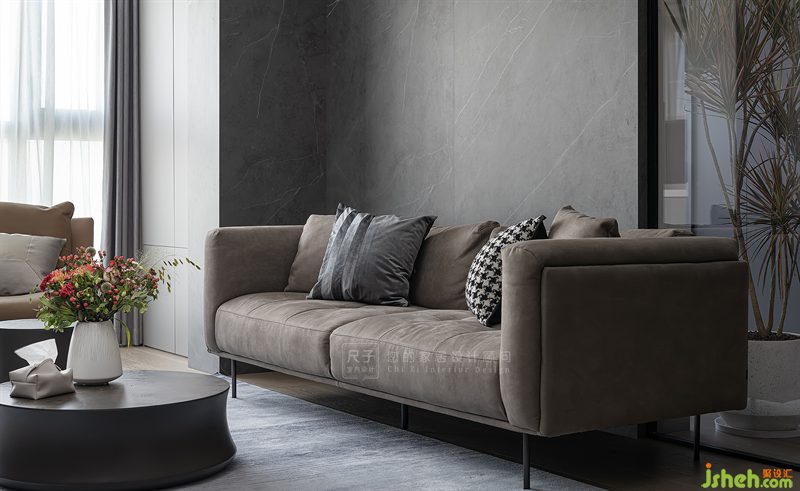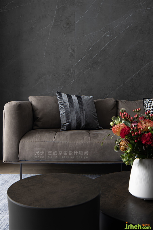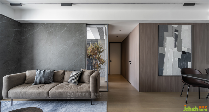 基于業(yè)主喜歡的低調(diào)配色與高級(jí)質(zhì)感,我們以灰色巖板與通透的玻璃碰撞出一面獨(dú)特的沙發(fā)背景,低調(diào)細(xì)膩中形成和諧反差。