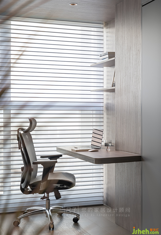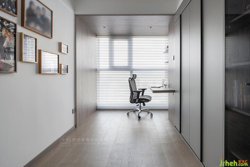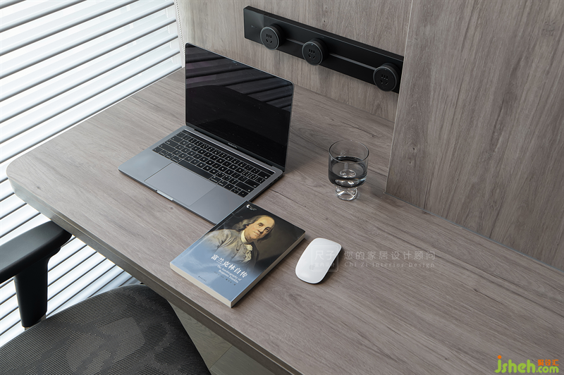 沙發(fā)玻璃墻背后便是半開放式的書房,原本的陽臺(tái)位置納入室內(nèi),天花與墻體以木飾面板包裹,圍合成一方工作區(qū)。