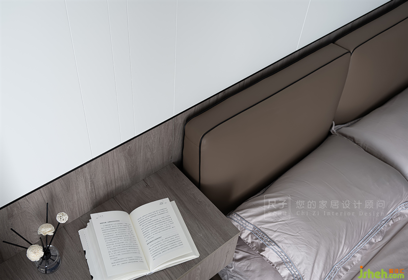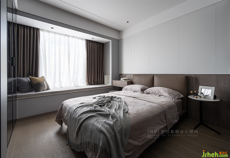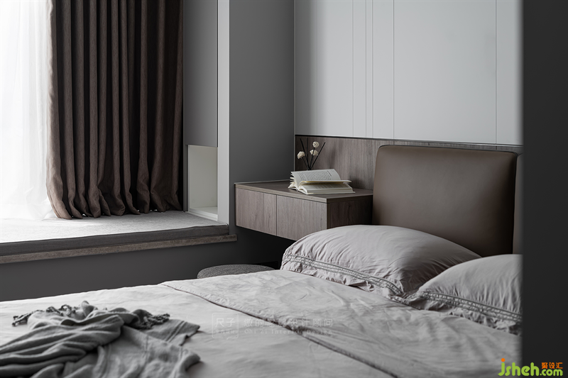 主臥延續(xù)了整體的風(fēng)格,以線條和不同材質(zhì)的拼接勾勒出寧靜雅致的氛圍。