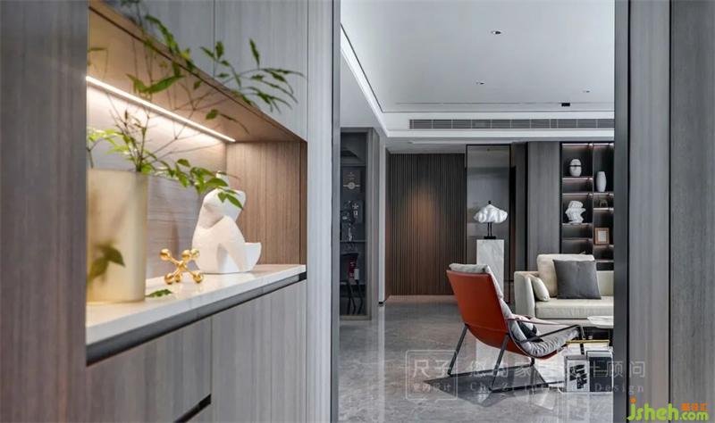 透露著現(xiàn)代氣息的玄關(guān)由灰棕色木飾面板裝飾包裹而成,開放格和通透的長虹玻璃推拉門,構(gòu)成了張弛有度的設(shè)計效果,打破空間的沉悶無趣,使家居生活更加愜意舒適。