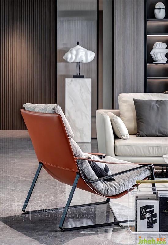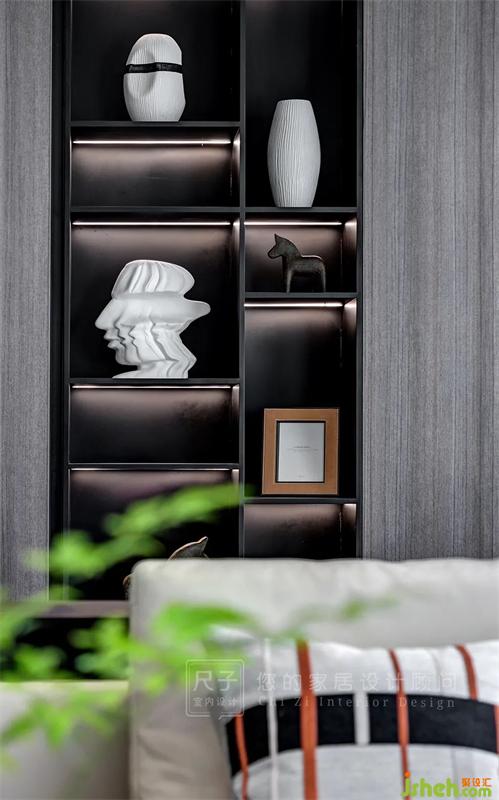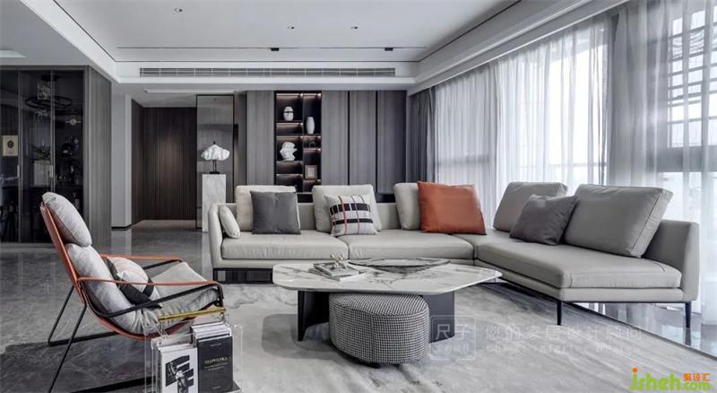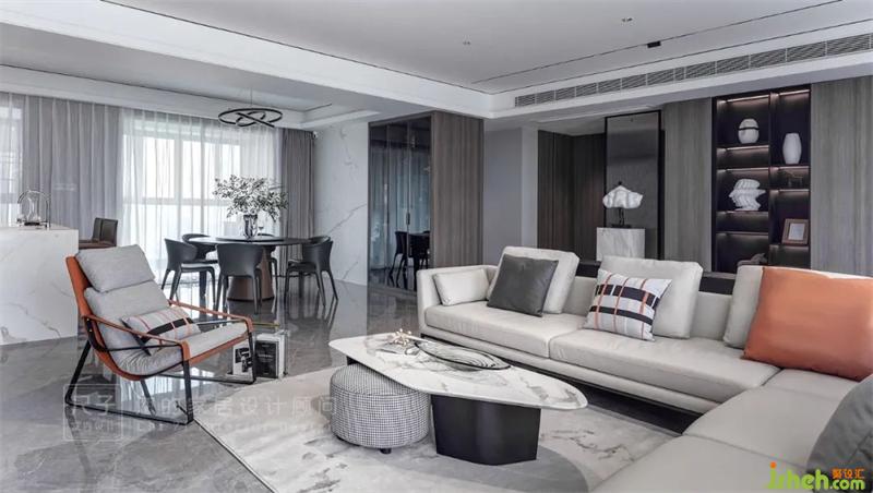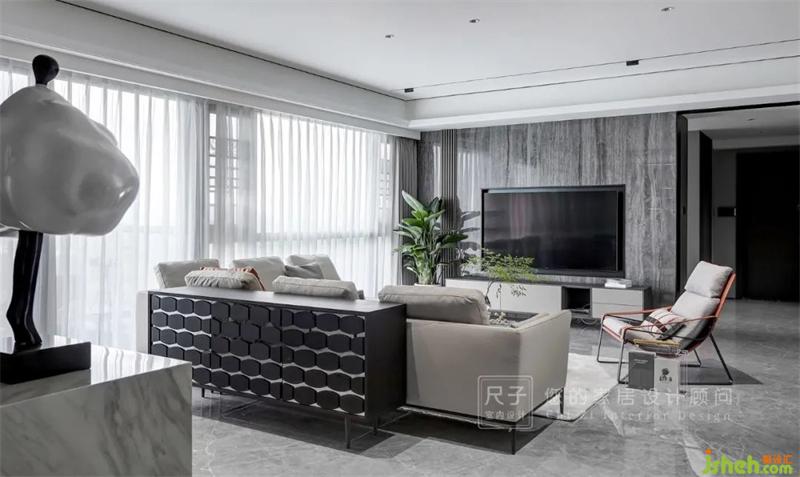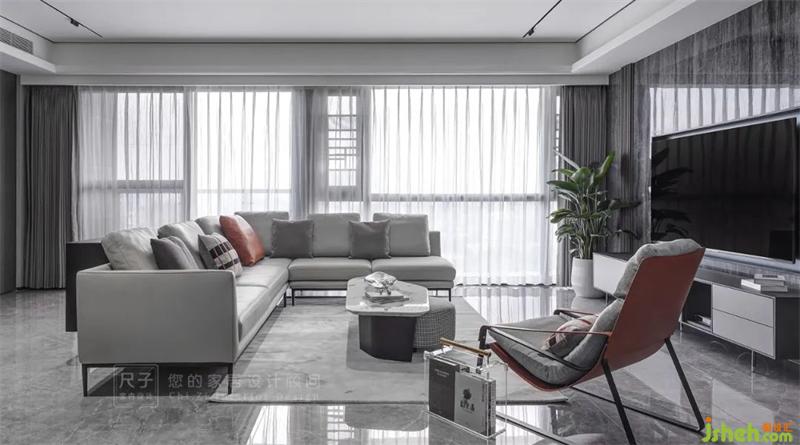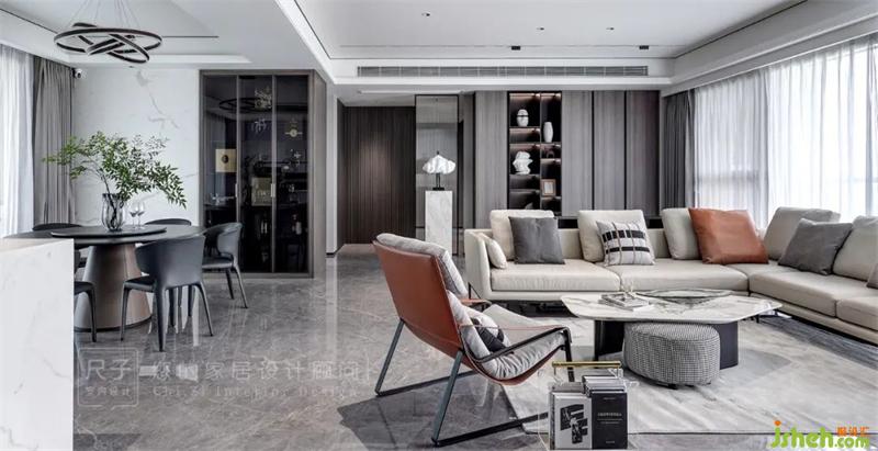 客廳盡頭的柜子與玻璃屏風(fēng)組合延續(xù)著玄關(guān)的設(shè)計元素,空間是聯(lián)系的;圍合式的沙發(fā)與地毯組合,透露著悠閑安然的氣息,讓一家人身處其間便能身心放松、卸下疲憊。