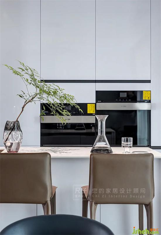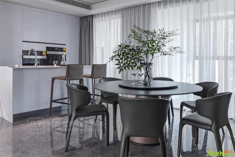 白色的島臺與圓形餐桌讓空間動線靈活流暢,蜿蜒的圓形吊燈與透明酒柜將用餐的氣氛渲染得溫馨浪漫,以靈活的功能和動線組合,讓家居生活更為便捷,營造了豐富的生活視角。