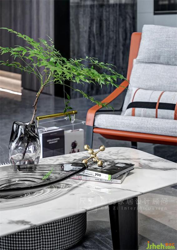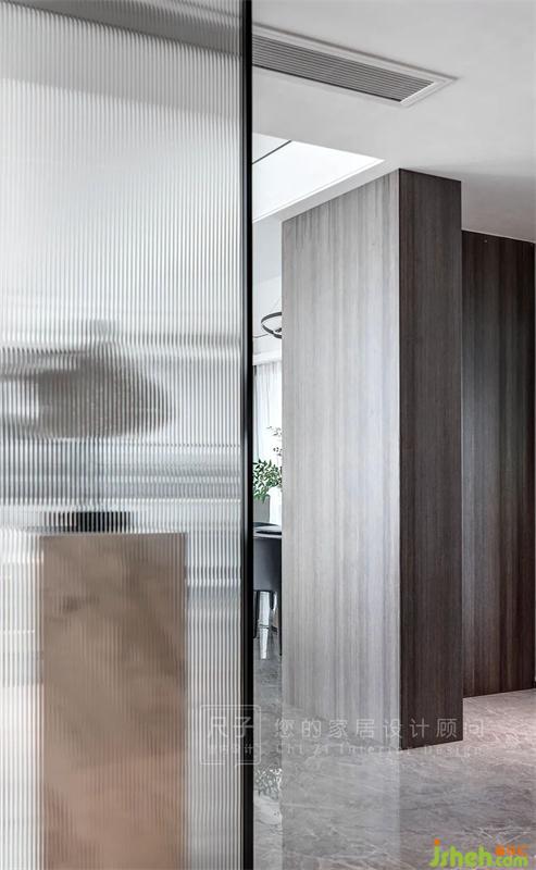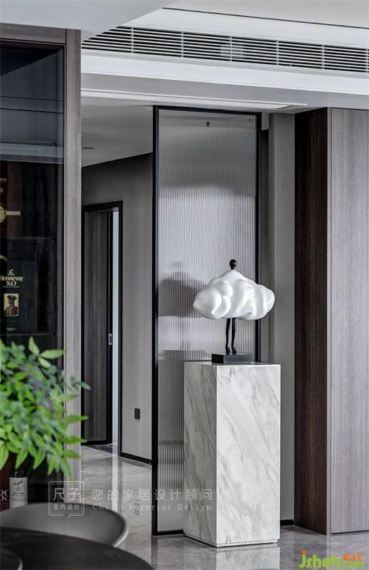 過道區(qū)域以一扇長虹玻璃隔斷+石材立柱作為端景,也能避免入戶直沖臥室門的忌諱。