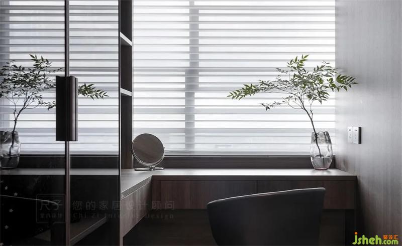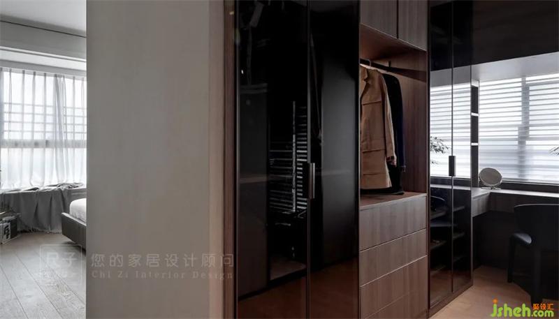 主臥增加了衣帽間做套房形式的設計,床側是到頂?shù)碾p排柜圍合出寬闊的衣帽間。