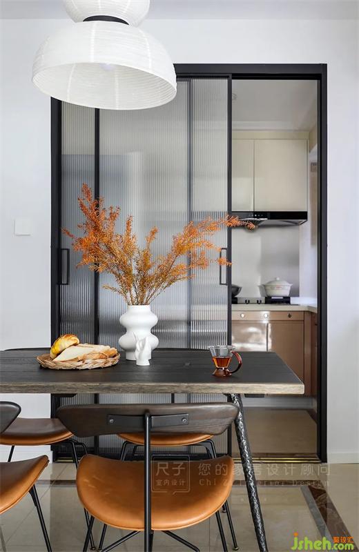 原廚房門拆除改為長虹玻璃推拉門,餐廚區(qū)呈現(xiàn)出來的狀態(tài)是開放多元,且通透無阻礙的??臻g除了既定的功能屬性外,更是與家人交流的場所。