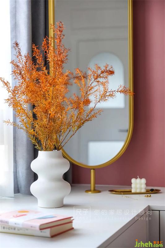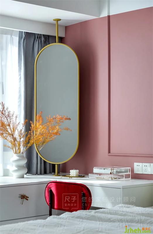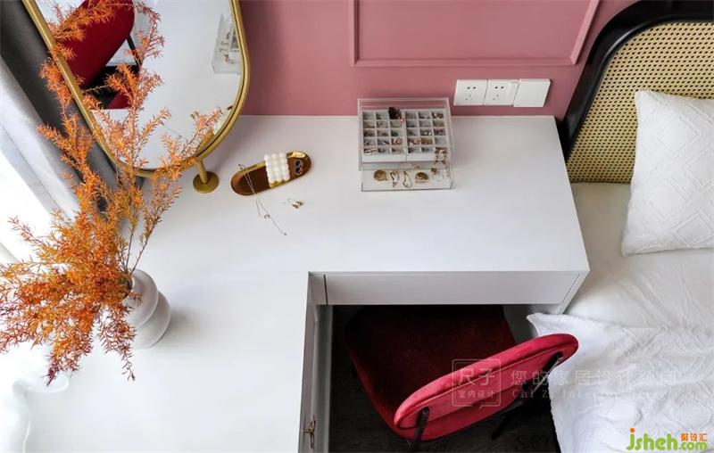 靠窗處將飄窗改為更加實用的梳妝臺,可旋轉的梳妝鏡,縱橫交錯的藤編床頭,織就精致又實用的臥室。