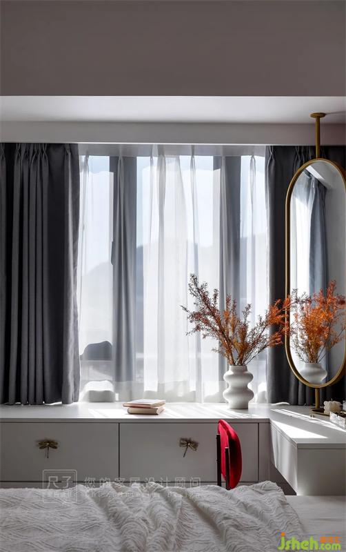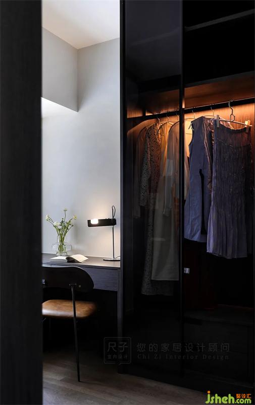 衣帽間定制了時尚的黑玻衣柜,還利用飄窗臺做了懸空書桌設計,將書房的功能結合起來,這里也是可以隨手翻看書籍的角落。