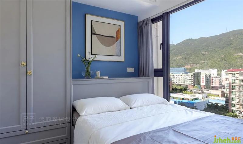 次臥是長輩的房間,在有限的空間內(nèi),榻榻米床與衣柜很好地滿足了臥室的功能需求。整面落地窗帶來良好的采光與風景,讓原本寧靜的深藍色添加了一絲清透感,高雅又不缺乏溫馨。