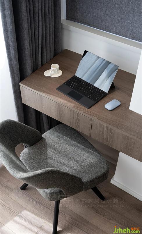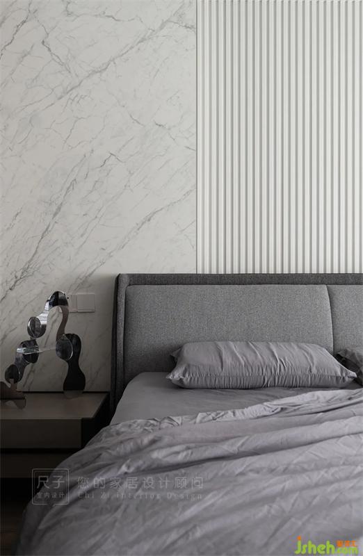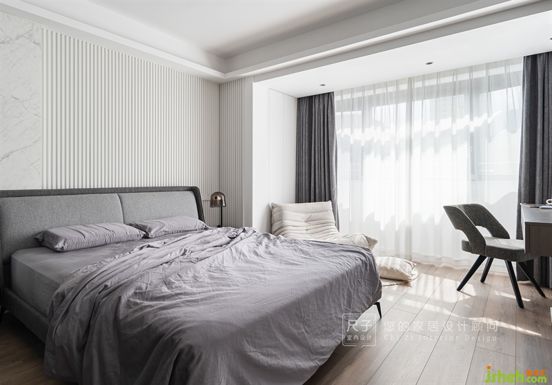 主臥以套房形式設(shè)計(jì),更注重實(shí)用和舒適性。封了陽(yáng)臺(tái)作為休閑+閱讀學(xué)習(xí)區(qū);睡眠區(qū)的床頭背景墻是巖板+波浪板的造型,清新明快,簡(jiǎn)約卻不乏質(zhì)感。