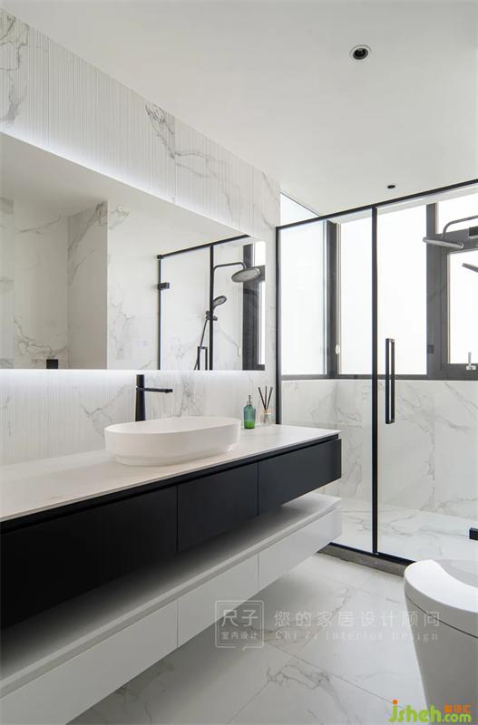 公衛(wèi)同樣是一個(gè)高顏值的空間,紋理感十足的墻面、皓白的臺(tái)面、黑白的抽屜,由淺到深的材質(zhì)遞進(jìn),建立明晰的功能層次。