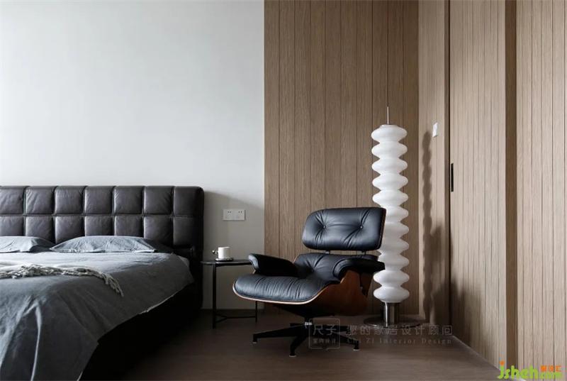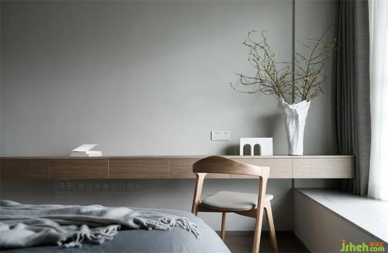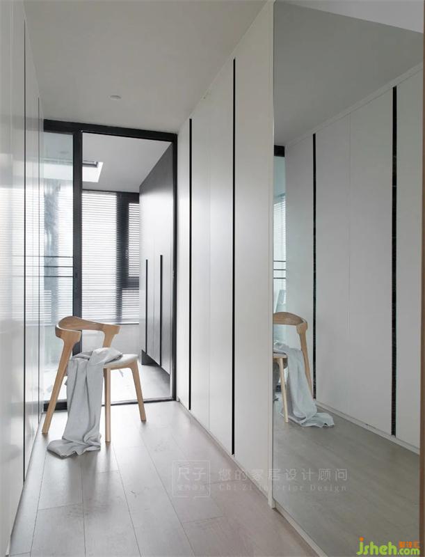 步入式的衣帽間以及床尾的懸浮桌面,則是對(duì)臥室功能性的補(bǔ)足。