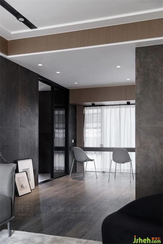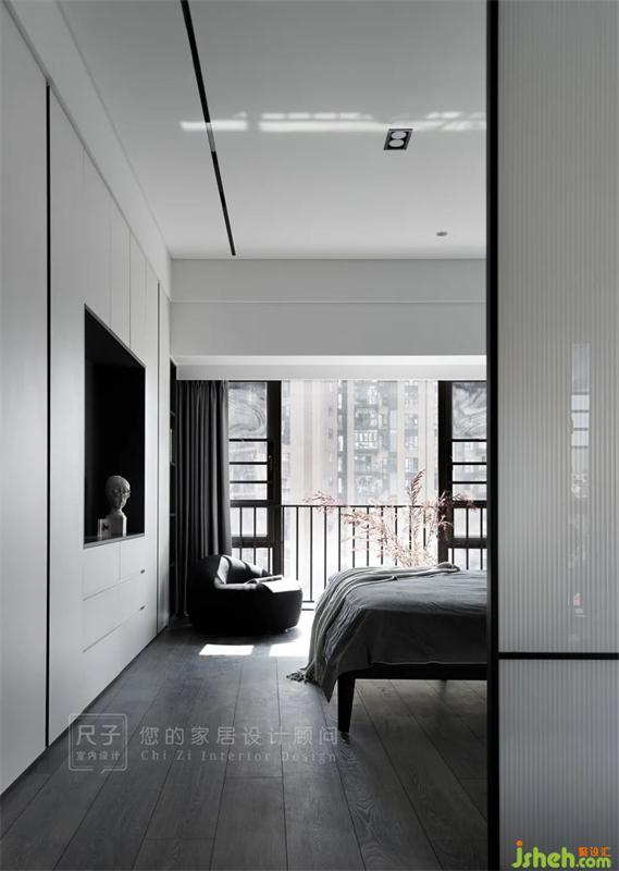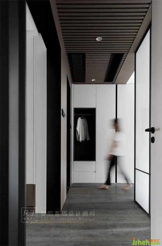 通往主臥的過道被靜謐的木色包裹,裝修設(shè)計從客餐廳到主臥形成自然地過渡,天花的格柵造型,進(jìn)一步豐富了空間的視覺表現(xiàn)。