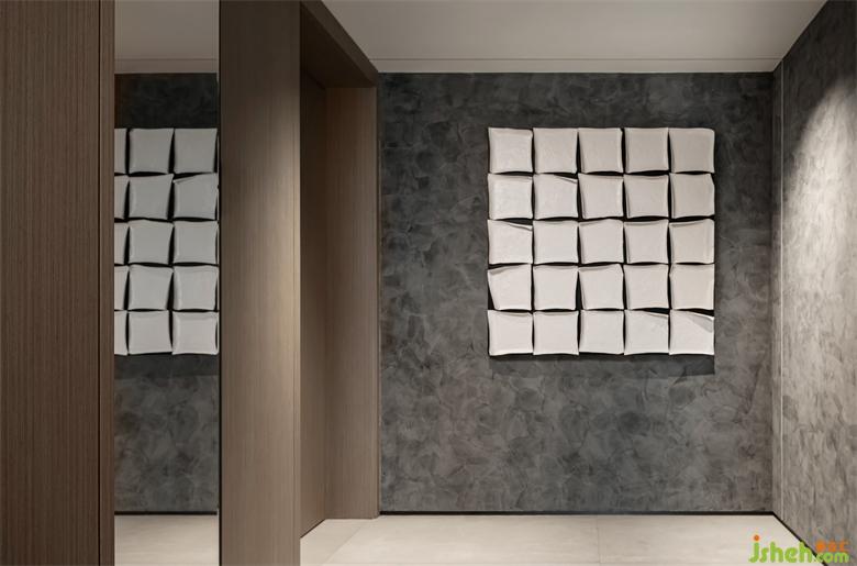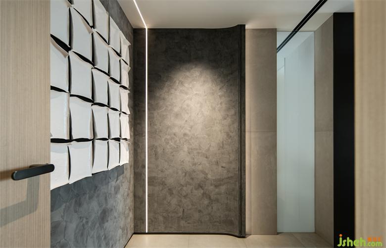 獨立的內玄關,保證了相對私密的空間界定,以及居住的儀式感。深圳家裝設計墻面嵌入了磨砂玻璃,以此改善內玄關與主衛(wèi)的采光。