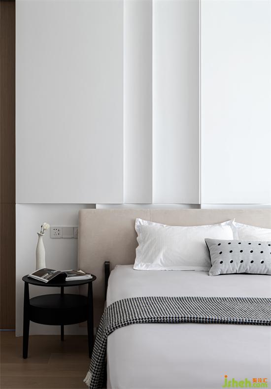 主臥睡眠區(qū)以溫馨、寧靜為基調(diào)。深圳家裝設(shè)計木色與白色的搭配簡單卻經(jīng)典,床頭背景是與客廳同款的波浪板,公區(qū)與私區(qū)既分割又不缺乏聯(lián)系。