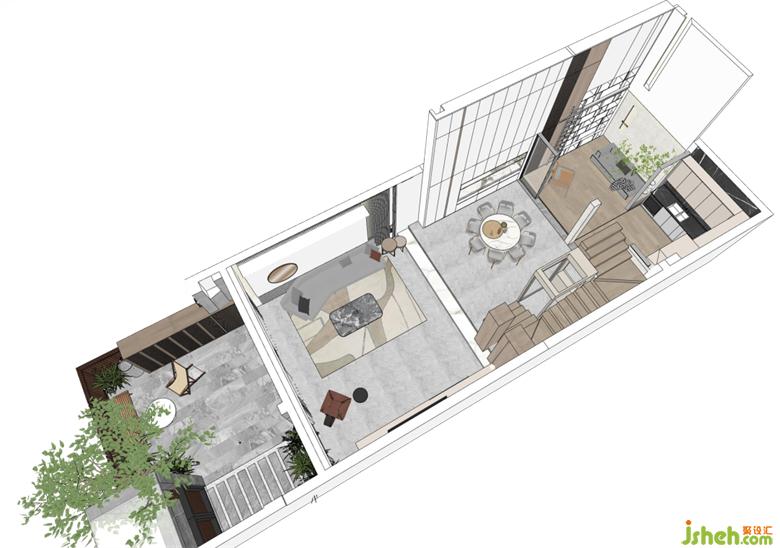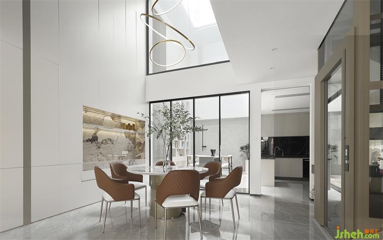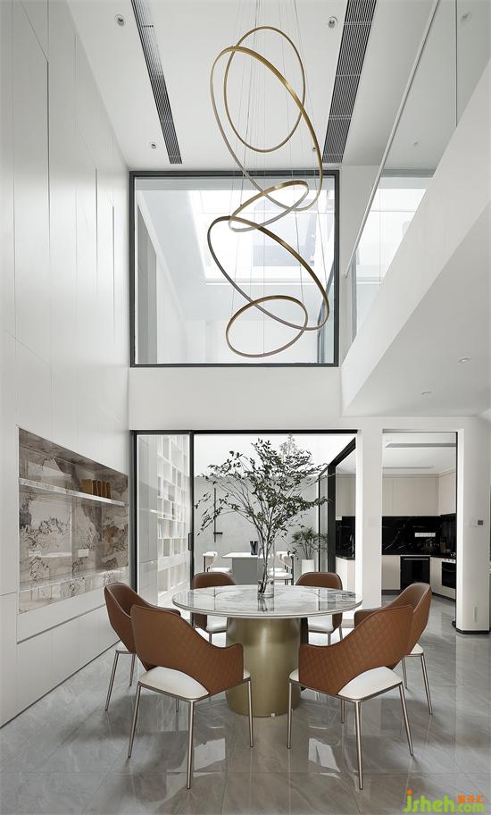 一層是客餐廚以及書房,打掉書房上面的樓層,做成采光井,來彌補(bǔ)一二樓采光差的問題。深圳聯(lián)排別墅設(shè)計(jì)通透的天井讓陽光無限照進(jìn),整個(gè)空間足夠開闊明亮。