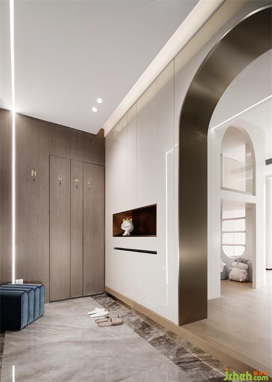 入戶的玄關(guān)分為換鞋區(qū)和兒童娛樂區(qū)。