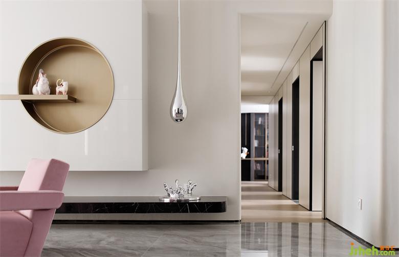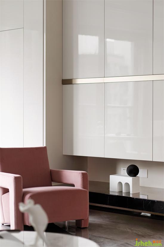 客廳儲(chǔ)物柜兼顧儲(chǔ)物和造型感,橫線條猶如人生的翹翹板,是這個(gè)家支撐了兩個(gè)小女孩的成長。深圳家裝設(shè)計(jì)白夜童話小女孩擺件、水滴的裝置、單人位沙發(fā)一粉一藍(lán)的搭配,餐廳的雙環(huán)鏡子、都圍繞其中。