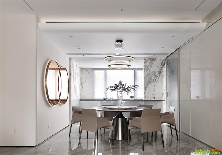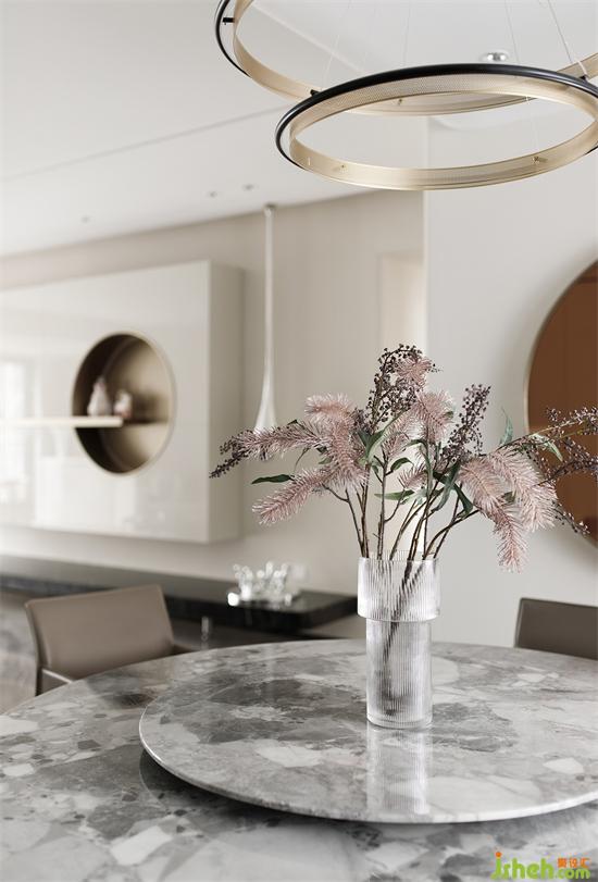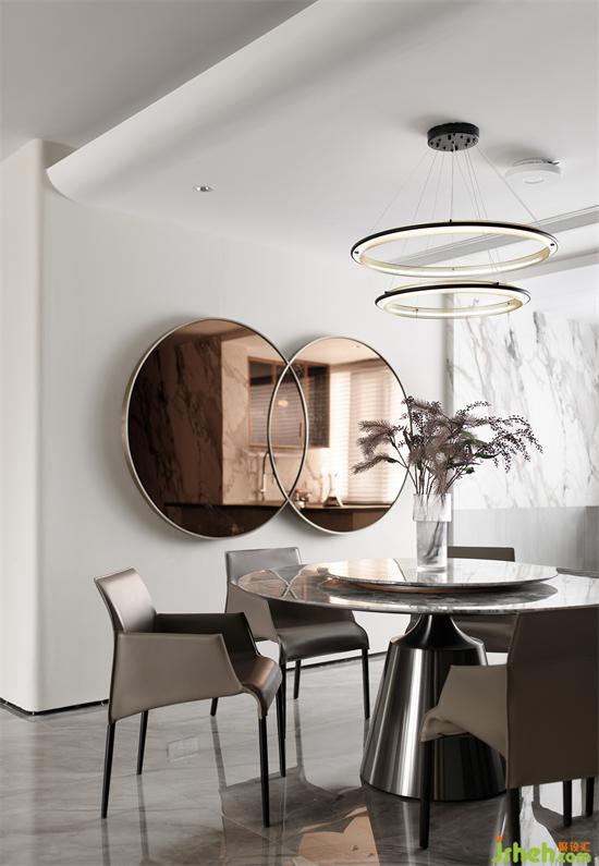 弧形線條遵循一定韻律延伸至餐廳,圓形元素在家具配飾上的運(yùn)用,深圳家裝設(shè)計(jì)讓整體氛圍清冽的餐廳多了絲絲柔和的感覺。