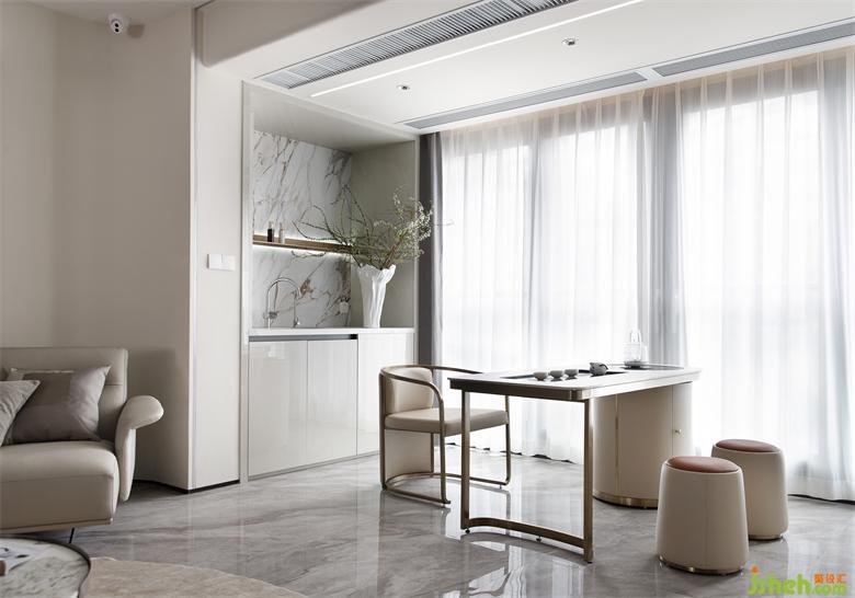 公共空間以淺奶咖色為主體色調(diào),遵循業(yè)主大家庭理念,將客廳、餐廳、茶區(qū)、西廚區(qū)相連的視覺特點(diǎn),帶來闊達(dá)的空間尺度,加上大面積的落地玻璃,更顯大氣。