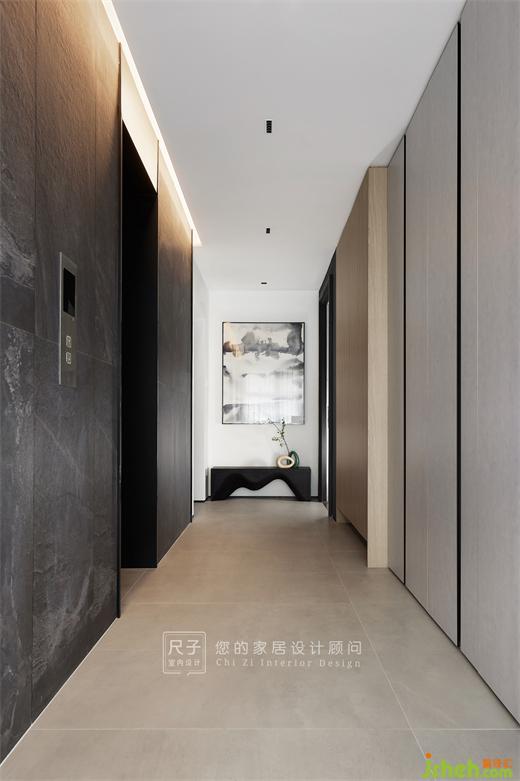 暖色光線在黑色紋理巖板上交織,創(chuàng)造出現(xiàn)代高級的美感,盡頭掛畫引人向前,家裝設(shè)計打開大門,與微微幽暗的電梯廳形成開明的對比,帶來“柳暗花明又一村”的感觀。