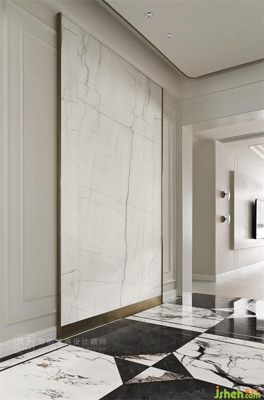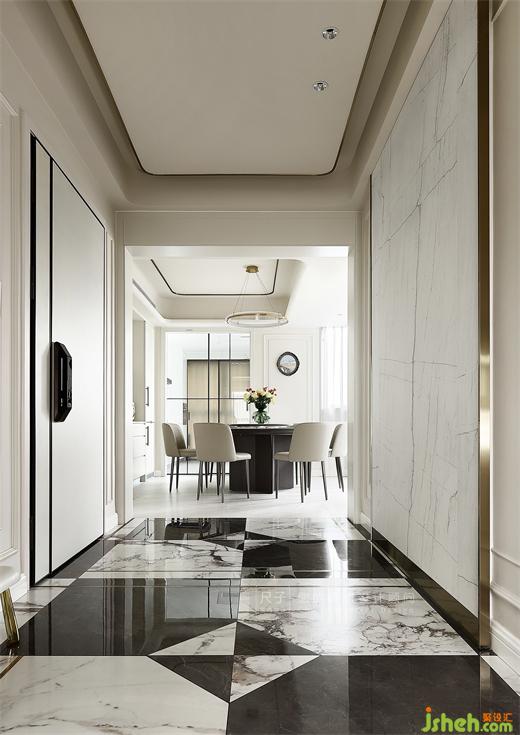 入戶豎廳的布局,玄關(guān)在客餐廳光線的暈染下,黑白瓷磚、巖板、金屬,在奶油色的基調(diào)中,呈現(xiàn)華麗且溫和的氛圍,法式線條元素結(jié)合,切實演繹精致與優(yōu)雅。