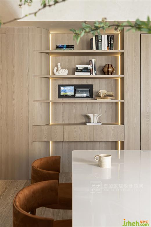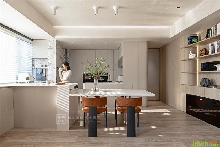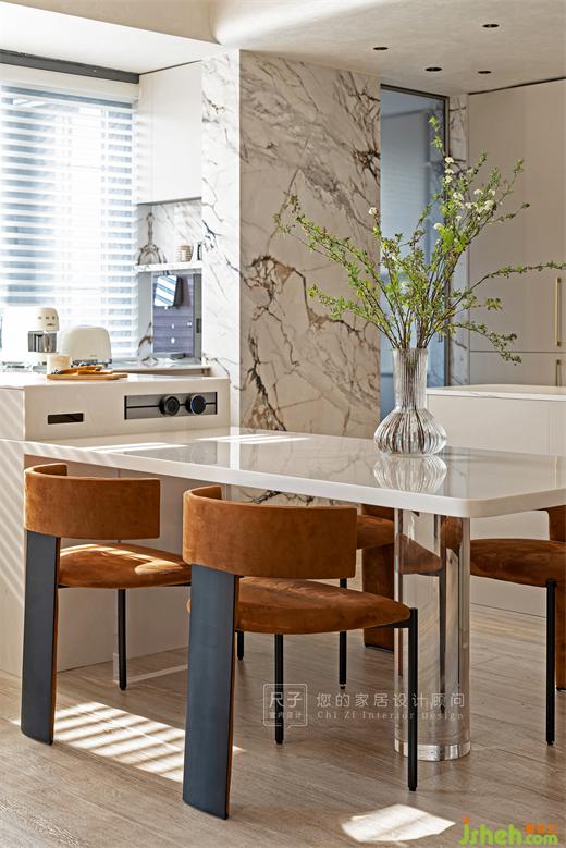 餐廳屬于橙色的那份美麗瞬間擴散,巖板將優(yōu)雅大氣展現(xiàn)得淋漓盡致,百葉窗濾過的陽光形成的粼粼光斑讓用餐區(qū)顯得更有魅力,將溫馨值拉滿。