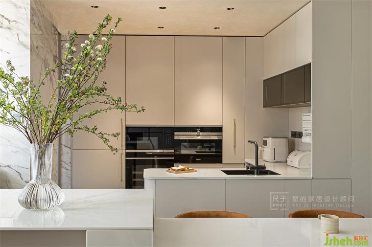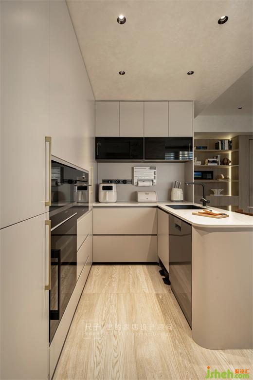 西廚和餐廳中間利用島臺進行了分隔,裝修設(shè)計不經(jīng)意間成為了一體化的界線,又彼此交融,加強了空間的流通性。電器與柜體結(jié)合的形式整個空間整體統(tǒng)一,U型布局儲物功能強大。
