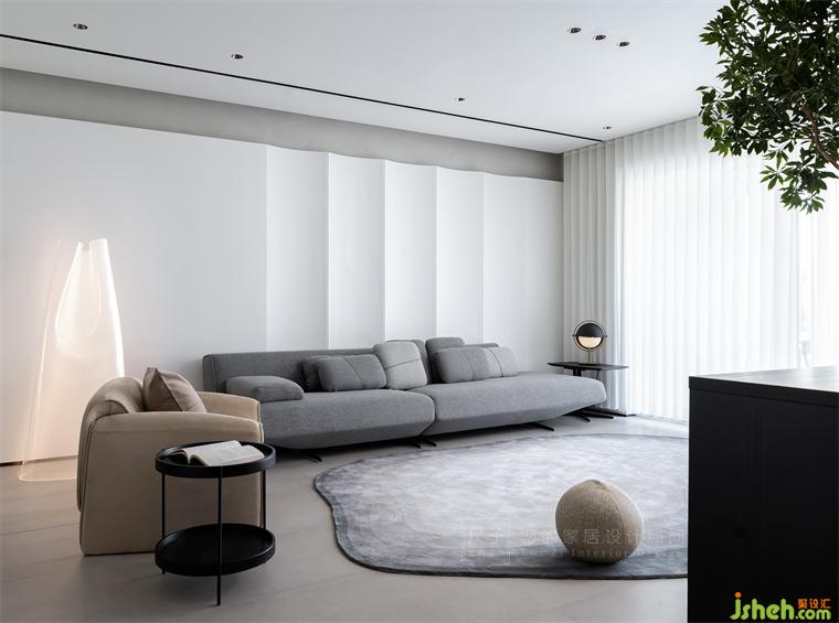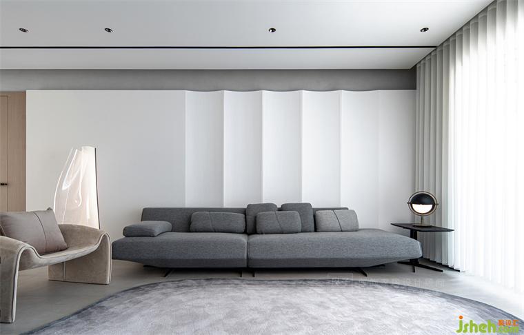 屋主希望家里是開闊通透的,于是便舍棄了笨重的茶幾,以一塊不規(guī)則造型的地毯,圈出適合孩子玩樂的“安全區(qū)”。