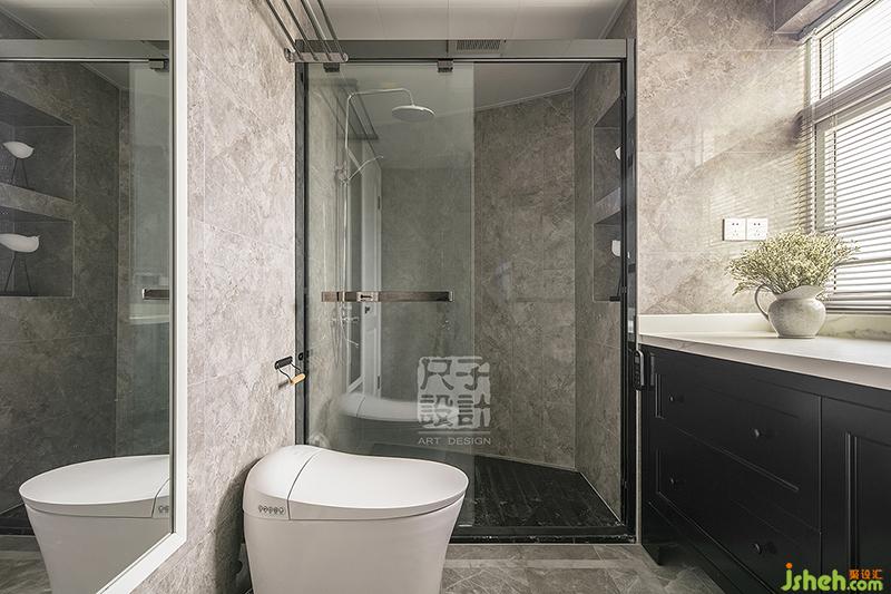 灰色仿大理石瓷磚鋪設(shè)的浴室簡(jiǎn)潔大氣,搭配黑色浴室柜極具現(xiàn)代感。