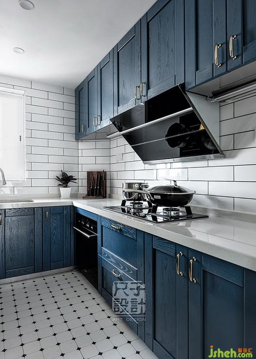 廚房藍(lán)色實(shí)木柜門配合不銹鋼柜體堅實(shí)耐用,花色瓷磚地板的搭配俏皮別致。