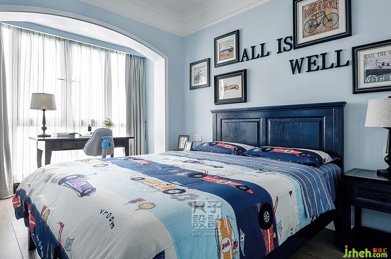 All is well是小主人最喜歡的一句臺詞,我們將它設(shè)計在背景墻中,愿一切都是最好的安排;深圳裝修設(shè)計背景墻上的裝飾畫與床上用品的小汽車互相呼應(yīng),兒童房的設(shè)計充滿活力。