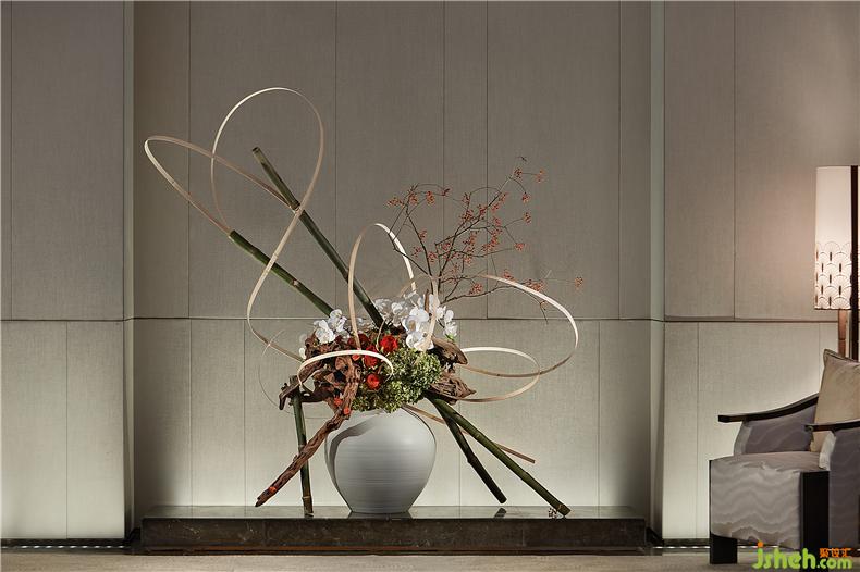 從洽談區(qū)穿過(guò)長(zhǎng)廊來(lái)到VIP室,自忖幾許雍容與華貴的古典綠散發(fā)著神秘深沉的力量,猶如探尋無(wú)人涉足的森林深處,而VIP室的《草月流·花道》便像是這森林里的瑰寶,打破古典花道在材料、容器表現(xiàn)的空間的舊有框架,展現(xiàn)自由、與現(xiàn)代生活相適應(yīng)的多樣風(fēng)格。