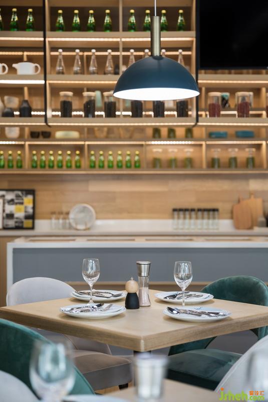 室內(nèi)設(shè)計師運用大面積的原木色烘托一種舒適溫馨的氛圍,餐桌延續(xù)餐廳的主題基調(diào)原木色,而餐椅則分別選擇象牙白和玉簪綠進行搭配,使得整個空間看起來更加愜意。在燈飾上選擇顯色性較強的白熾光源,溫暖明亮的光線亦可以為餐廳增添一抹別樣色彩。