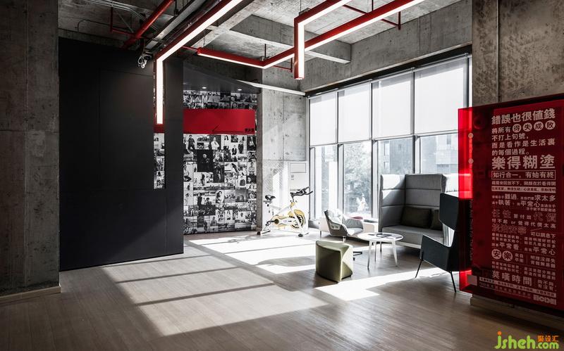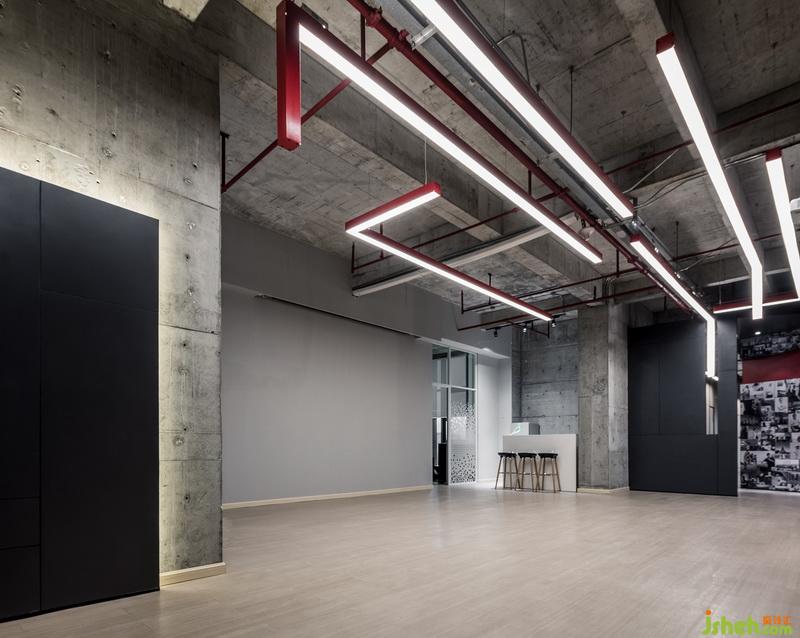 在垂直空間上,運(yùn)用吊燈作水平光面分離雜亂的天花板和使用空間。整個辦公空間通過空間切割使得佈局合理恰當(dāng)充滿趣味。