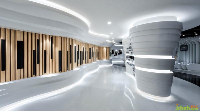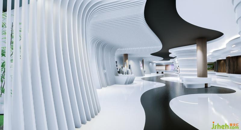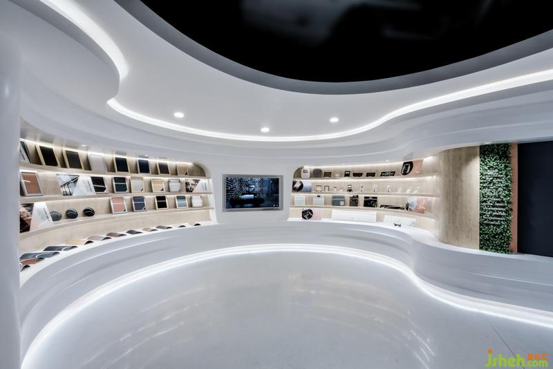 音樂(lè)與空間具有共通性,因此設(shè)計(jì)師以音樂(lè)韻律作為設(shè)計(jì)手法,品牌展廳如背景音樂(lè)散發(fā)出優(yōu)美的旋律,承載著多姿多彩的產(chǎn)品展示和來(lái)訪者對(duì)品牌的體驗(yàn)。當(dāng)人們步入展廳,行雲(yún)流水的線條在眼前依次展開(kāi),視覺(jué)像音樂(lè)的節(jié)奏一樣交替變幻,演繹出韻律美的空間氣質(zhì)。